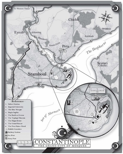 Investigation into the background of Kuradeth—the cultist spy in the Embassy—yields us nothing of use. We decide to take the ferry across the bay from Pera to Stamboul to further our investigations there. We take a cab to the Sultan's Bath House. Front of house staff refuse us entry. Baylab the Perspirer does not accept unsolicited callers, so we arrange to come back tomorrow afternoon, at 4 o’clock. Its mid-afternoon and we decide to conduct research—specifically into references to the Red Mosque, Selim Makryat and Garaznet the Thief. To make best use of the remaining opening hours, we split up to divide ourselves between the University library and the Topkapi once more.